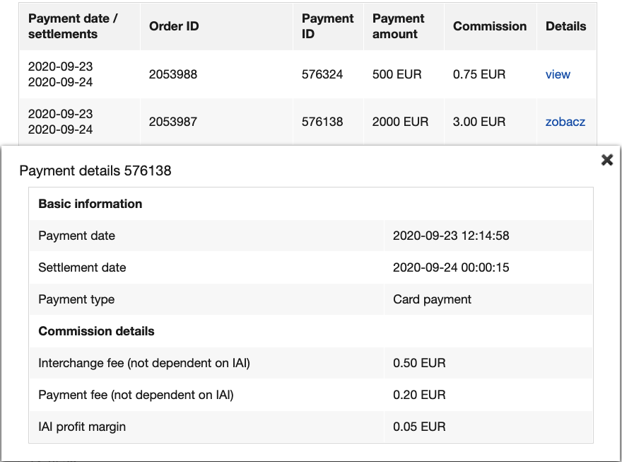 Until now, information on completed ((integrations/payments/banks |IAI Pay payments)) could be obtained from the payment list, while information on commissions was presented as aggregated fees charged on the balance. To make it easier for you to control and to make sure that you are using the most attractive offer, we have prepared a new module where you will find all information about payments made.