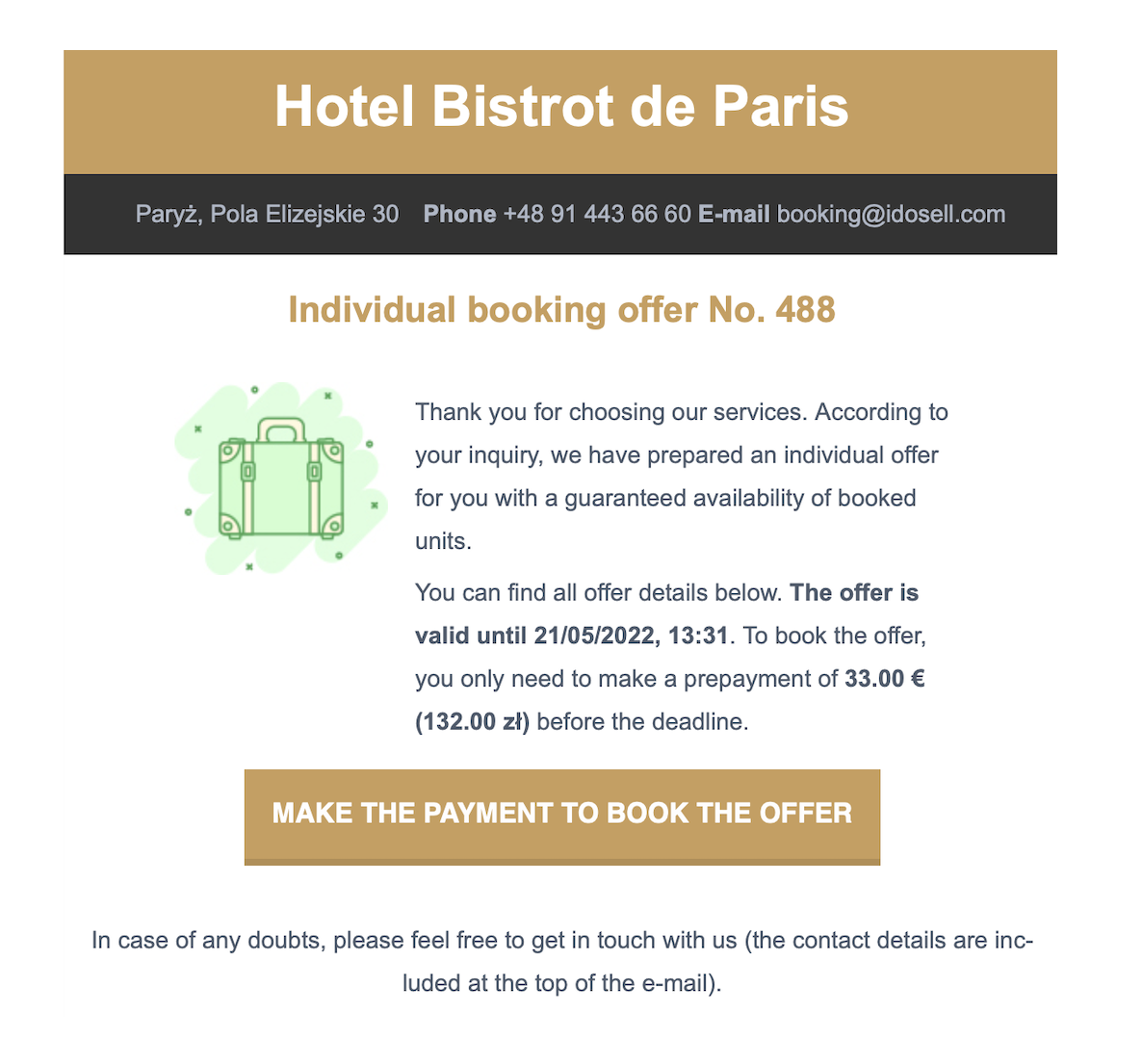 The customer contacts you directly because they would like to verify that this place is really ideal for their dreamed and awaited holiday. If you have the pleasure of talking to him, you receive a package of information about what he expects. On the other hand, he has just met you and now all you have to do is convince him that your property is the perfect place for his holiday. How to do it? Opt for an individual approach. Everyone likes to be treated as an individual. A good way to follow up this conversation is to prepare an individual offer for accommodation, detailing the costs and highlighting the benefits. What might additionally convince you to book, for example, is a small discount. If, on the other hand, you don't want to change the rates - use other tactics - give a discount code for the next stay, or provide a parking space, or prepare something special for the arrival - such as a fruit basket or wine waiting in the room. If you don't have these options, perhaps you know the owner of a nearby restaurant or bike rental - negotiate a discount for your guests and add it to your offer. Don't forget, to be effective, your offer must be time-limited. Don't give your customers too much time to think and look for other options.