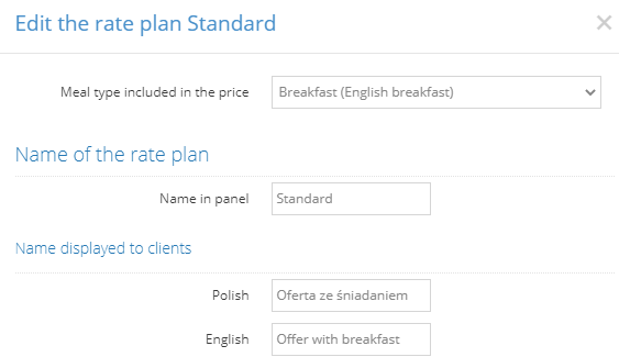 You can combine meal types and offer guests a deal with, for example, breakfast and dinner included in the rate plan. You can also create a new dependent plan with meals, generating prices based on one of the current rate plans.