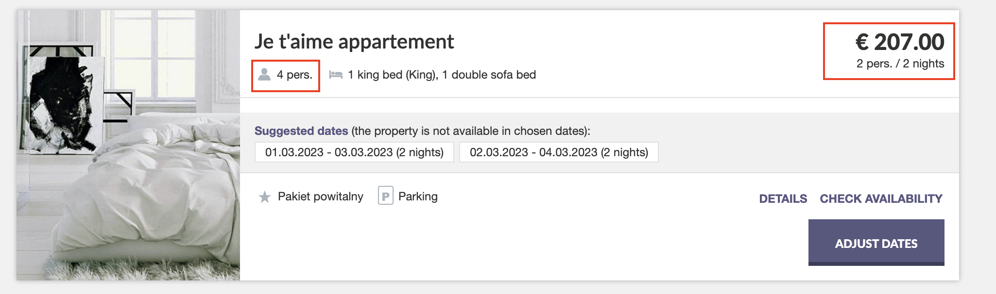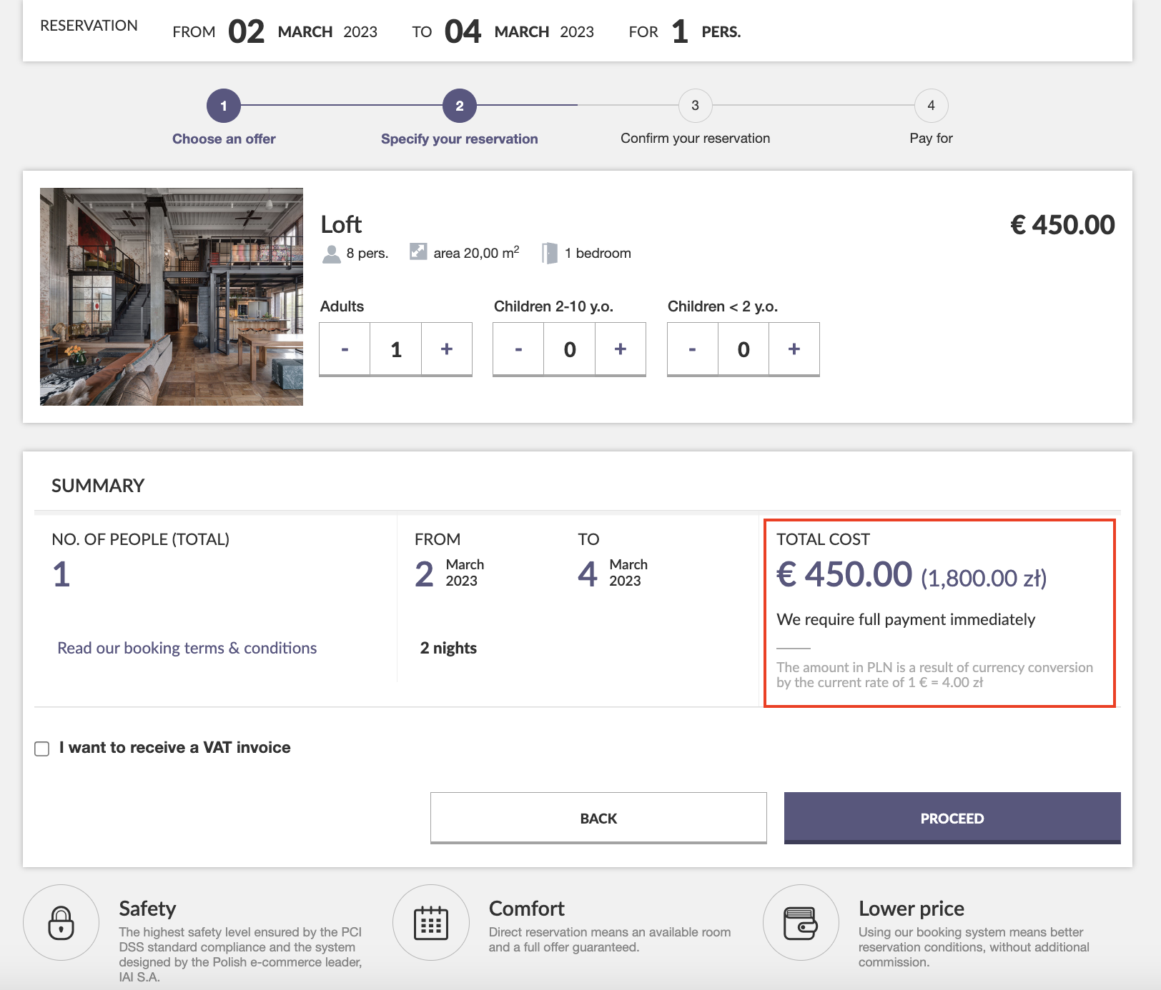 A basic principle to follow when building a website's friendly UX is showing truthful information and using unambiguous messages. Creating artificial discounts or using vague wording will not inspire confidence in customers. Already in the first step, show the true number of rooms to be booked and the final price with all extras.